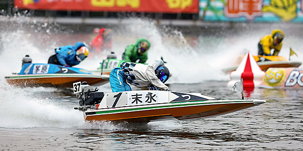 (写真下) 1周2M、1号艇・末永はVゴールへ一直線